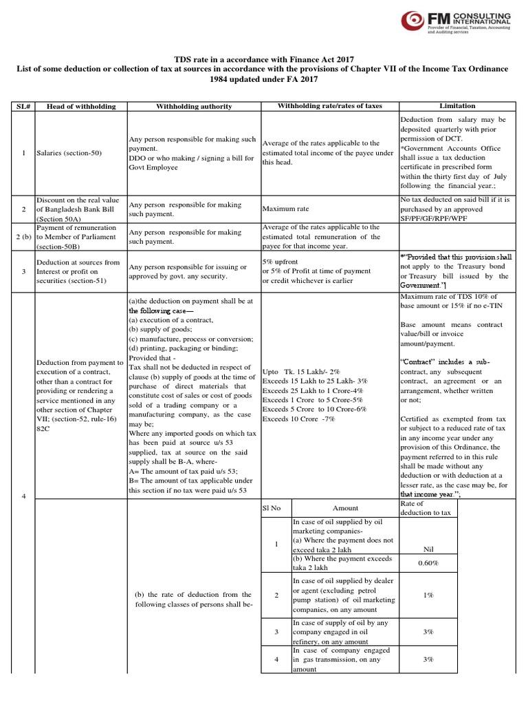 Tds Vds Rate Bangladesh Fmci 2018 2019 Invoice Tax Deduction